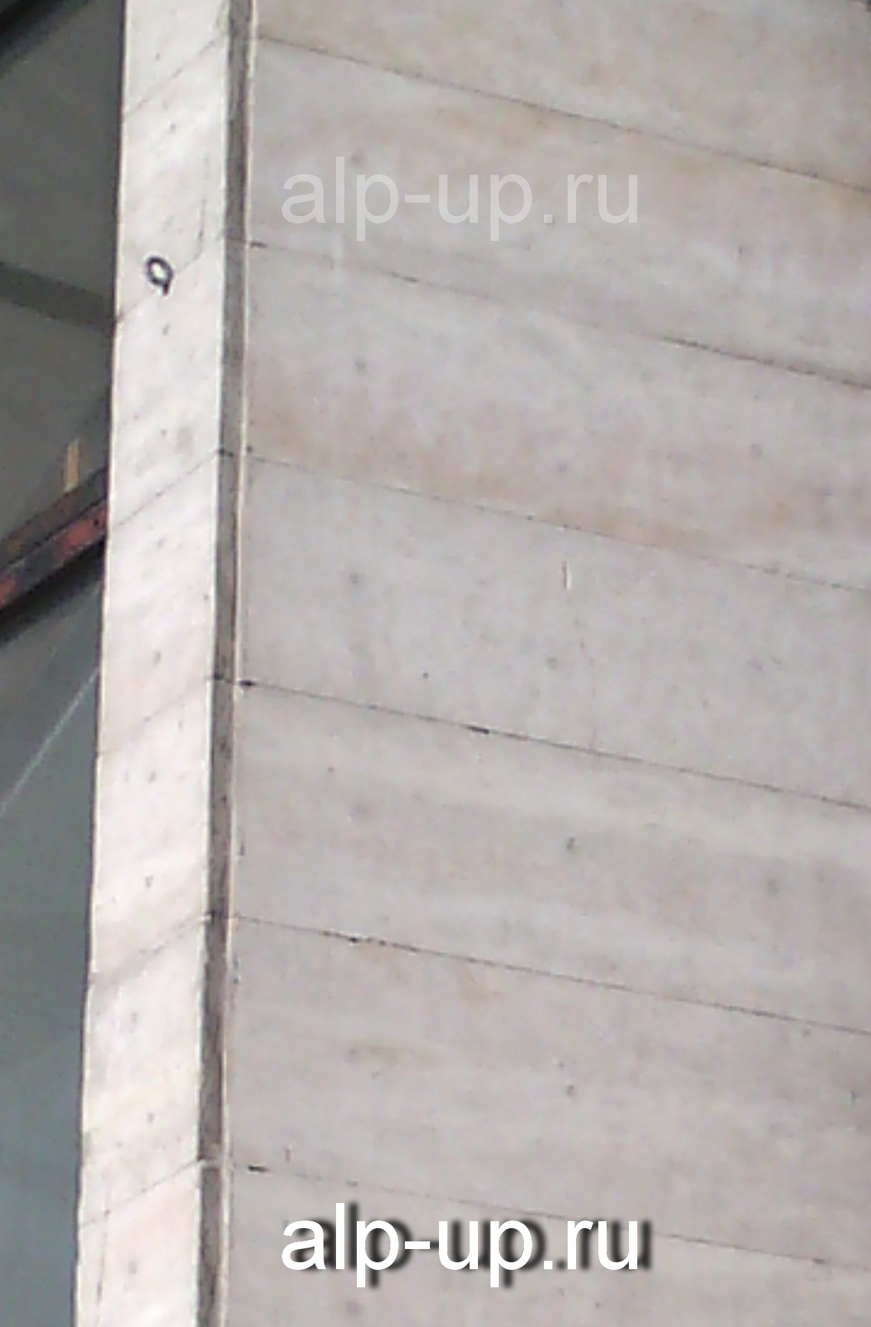 Так должна выглядеть качественно закрепленная облицовка из натурального камня. Надо сказать, что прочность закрепления визуально проверить нельзя и приходится полагаться на рабочую совесть исполнителей и контроль за соблюдением технологии закрепления облицовки со стороны подрядчика. А вот внешний вид может многое сказать об отношении к делу... Хорошо загерметизированные головки анкеров на фасаде практически не должны быть видны снизу.